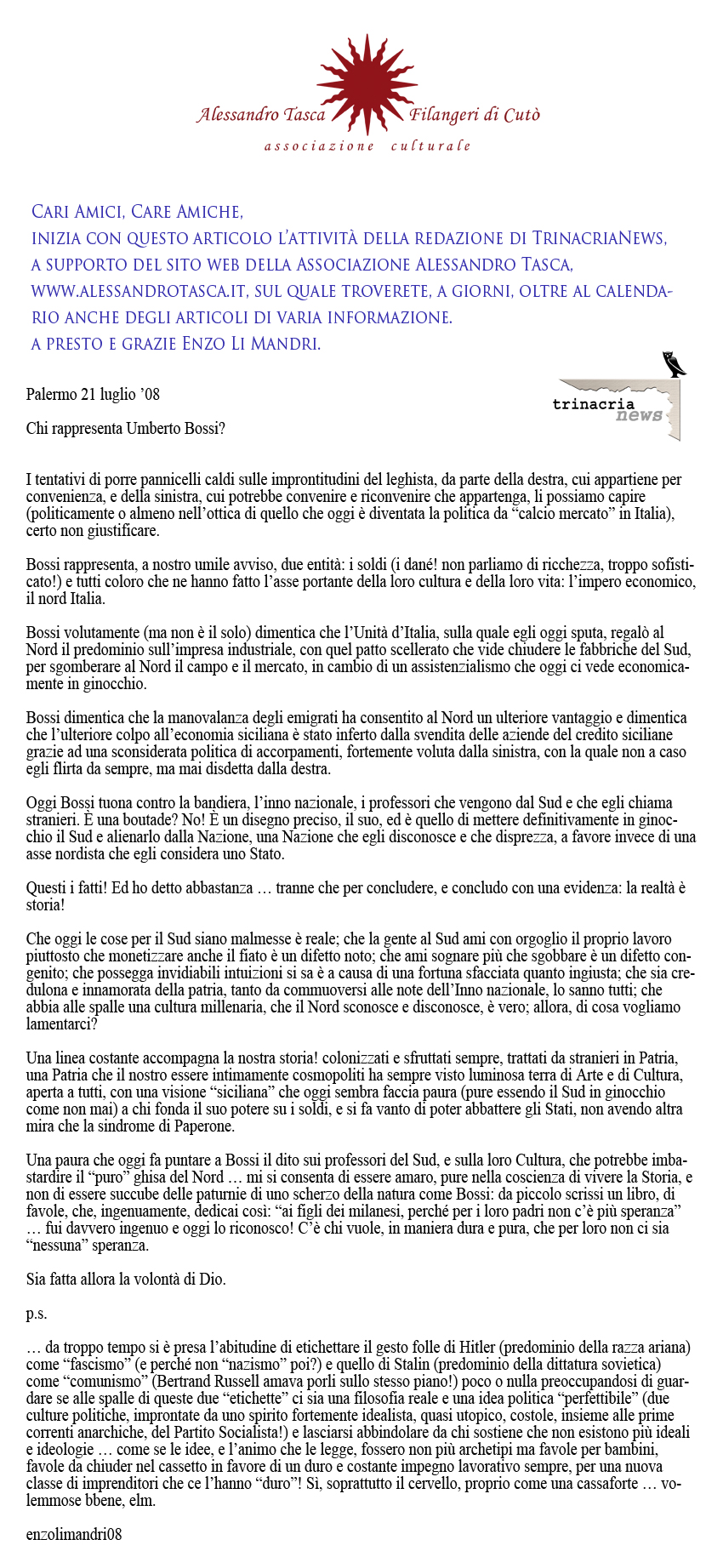 Bossi dimentica che la manovalanza degli emigrati ha consentito al Nord un ulteriore vantaggio e dimentica che l’ulteriore colpo all’economia siciliana è stato inferto dalla svendita delle aziende del credito siciliane grazie ad una sconsiderata politica di accorpamenti, fortemente voluta dalla sinistra, con la quale non a caso egli flirta da sempre, ma mai disdetta dalla destra.