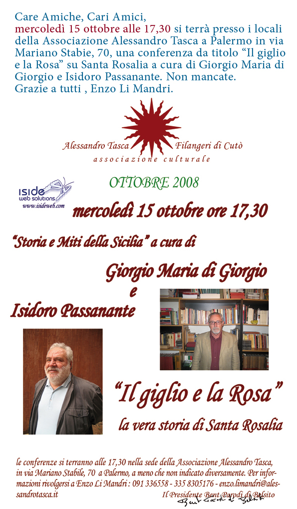 Giorgio Maria di Giorgio è uno studioso e appassionato della storia siciliana nonchè l'Editore dei Quaderni del Pitrè, Isidoro Passanante è studioso e appassionato di miti e simboli nella iconografia sacra siciliana. I due espsrti hanno collaborato in più di una occasione con l'intento di dare al tema trattato almeno due punti di vista e, quindi, due chiavi di lettura della storia, come archivio e maestra di vita.
